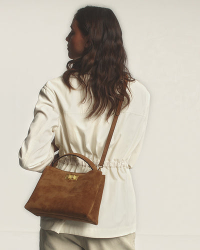 Sac shopper minimaliste semi-structuré en cuir suédé, issu d'une tannerie italienne certifiée LWG Gold. Anse épaisse en cuir pour un porté à la main et bandoulière ajustable en cuir pour un porté croisé. Intérieur entièrement doublé en suédine beige, avec poche centrale aimantée. Fermoir sur-mesure DuoLock™️ en acier inoxydable, finition PVD dorée. Fabriqué à la main en Italie.